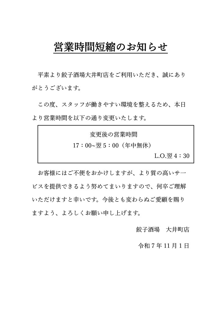 2025-10-28 / 最終更新日時 : 2025-10-28 gyozaooimachi3141 お知らせ・最新情報 2025年11月1日からの営業時間変更のお知らせです。 \ 最新情報をチェック / FacebookXBlueskyHatenaCopy コメントを残す コメントをキャンセルメールアドレスが公開されることはありません。 ※ が付いている欄は必須項目ですコメント ※ 名前 ※ メール ※ サイト 次回のコメントで使用するためブラウザーに自分の名前、メールアドレス、サイトを保存する。 上に表示された文字を入力してください。 Δ